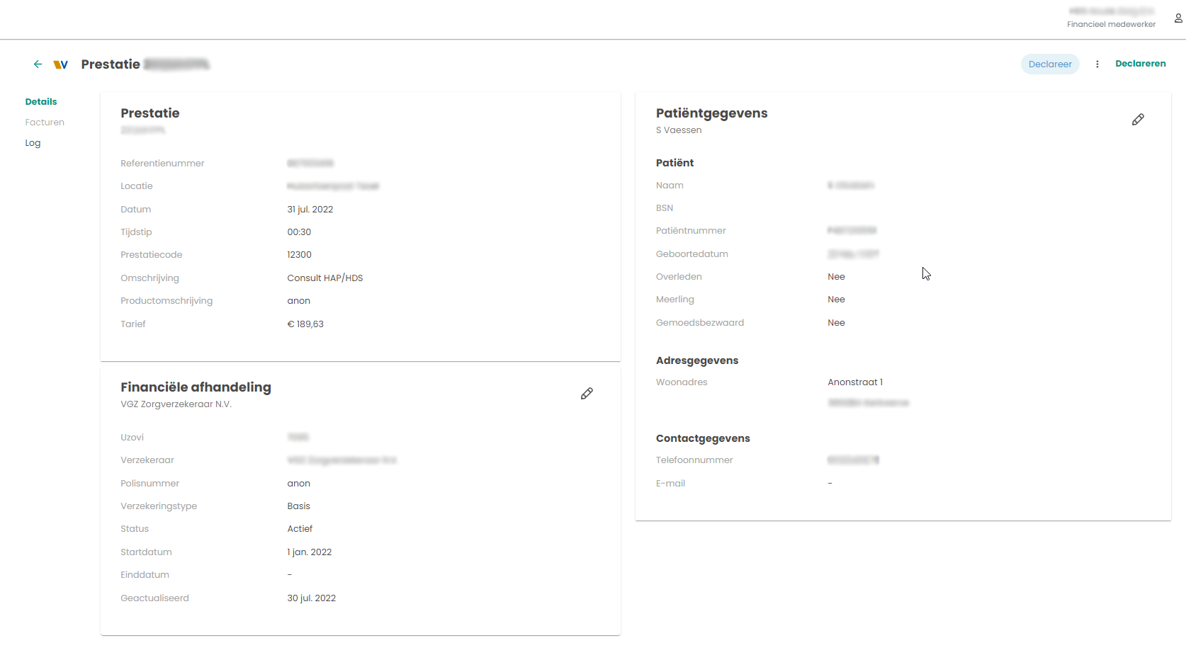 In het prestatie detailscherm wordt een patiënt waarbij de BSN niet bekend wordt als volgt weergegeven: