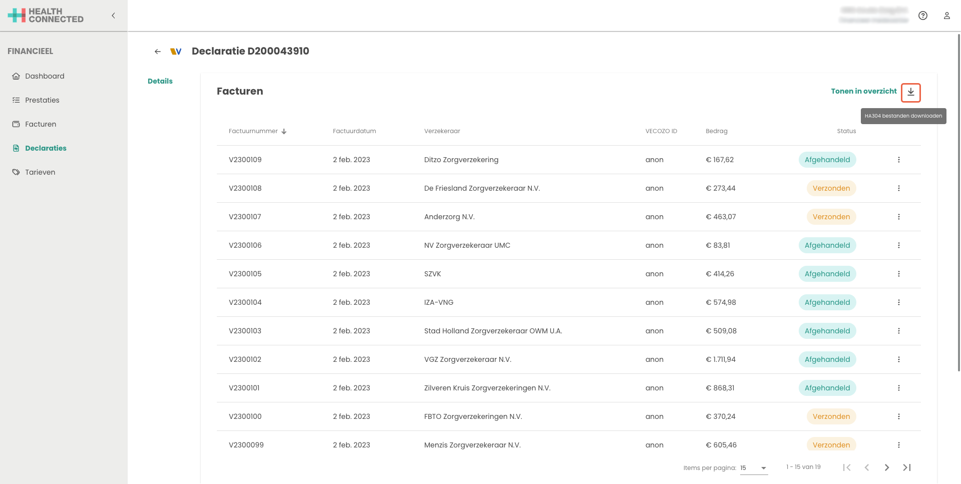Klik in het overzicht de laatst gedeclareerde declaratie aan. Hierbij opent het detailscherm van de declaratie. Link bovenin via het icoon is het mogelijk het HA304 bestand te downloaden.