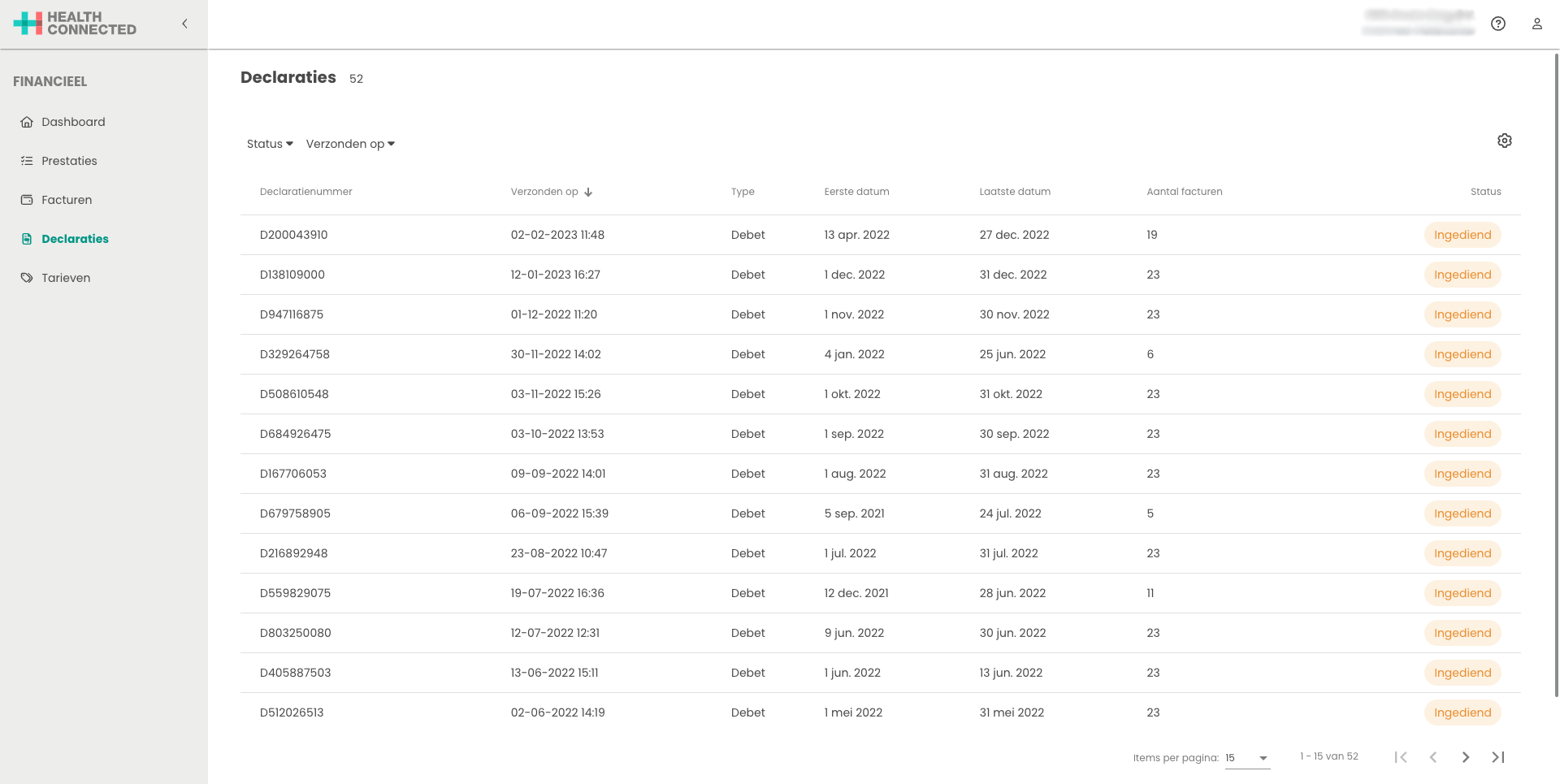 Open in het menu de pagina declaraties. Hierbij opent het overzicht met alle declaraties die zijn gedaan.