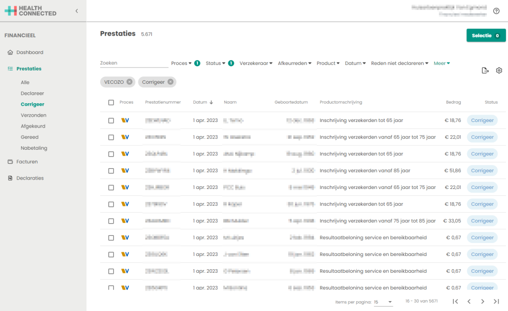 Indien er geen verzekeraar gekoppeld is bij de import dan komen de inschrijfprestaties onder “Corrigeer”’ te staan. Door de COV uit te voeren komen de inschrijfprestaties onder ‘Declareer’ te staan. Check dus altijd onder corrigeer of er inschrijfprestaties staan.