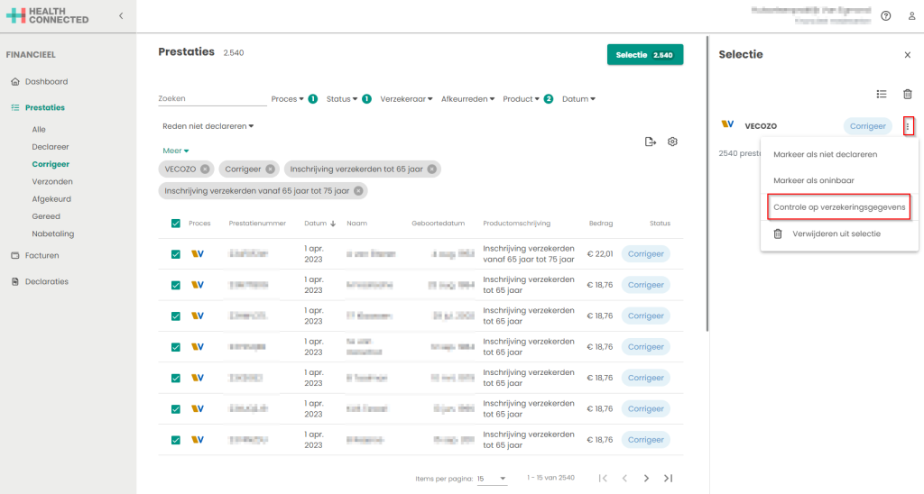 • Klik bij de geselecteerde prestatie op de 3 puntjes en kies “Controle op verzekeringsgegevens”. De COV controle wordt nu gestart over de selectie. Dit kan enige tijd duren.