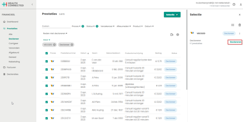 • Klik op de button ‘Declareren’. Het systeem gaat nu de prestaties vanuit de selectie opnemen in facturen voor de verzekeraars. Na het klikken op de button ‘Declareren’ is de selectie niet meer aan te passen. Het declaratieproces kan afhankelijk van het aantal prestaties van enkele minuten tot enkele uren duren. Wordt er gedeclareerd via VECOZO dan wordt het bestand automatisch verstuurd naar VECOZO.
