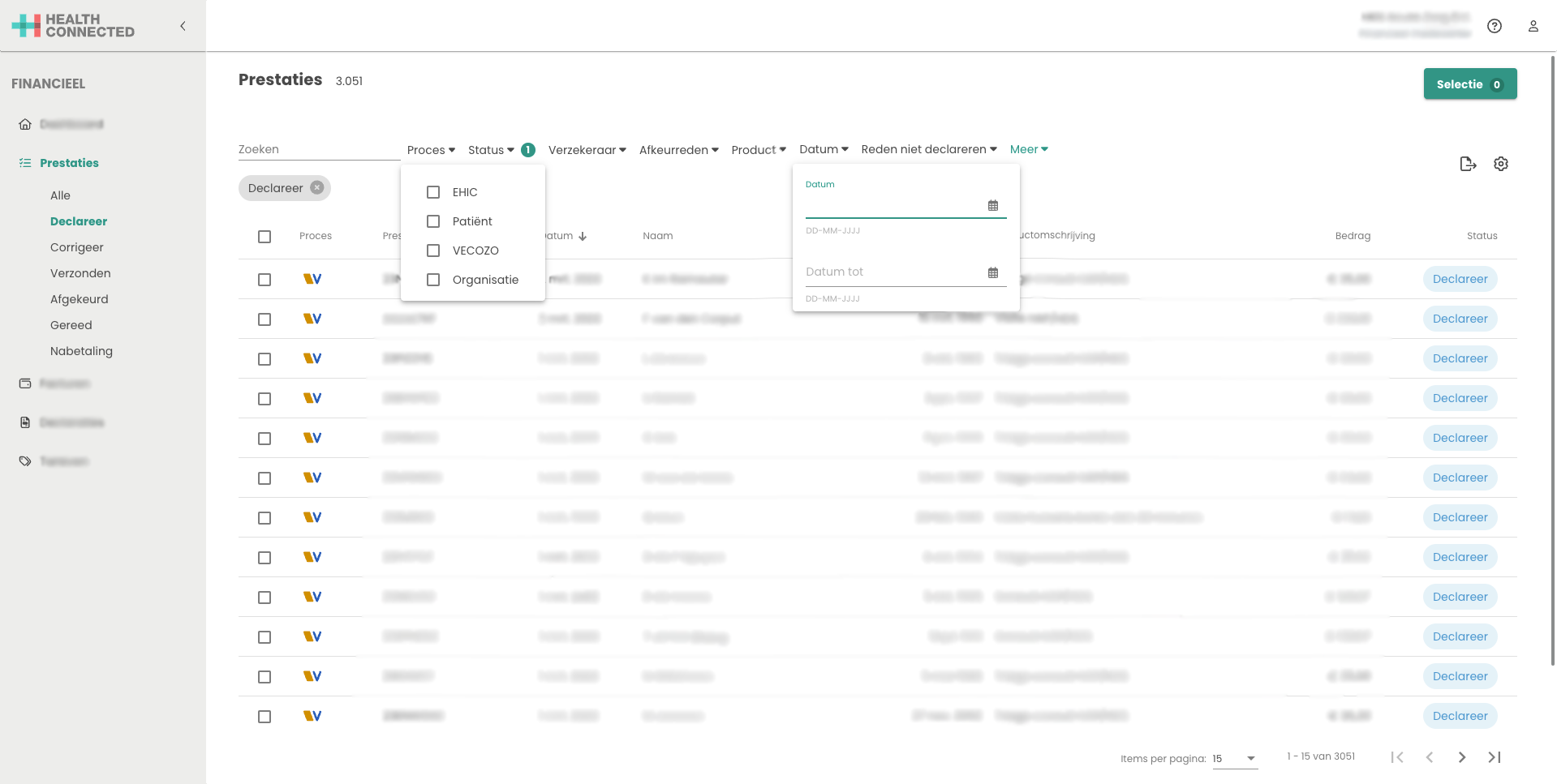 De prestaties die binnen zijn gekomen vanuit de HealthConnected applicatie zijn in het prestatieoverzicht te vinden. Voor het declareren van prestaties klik op de status declareer.