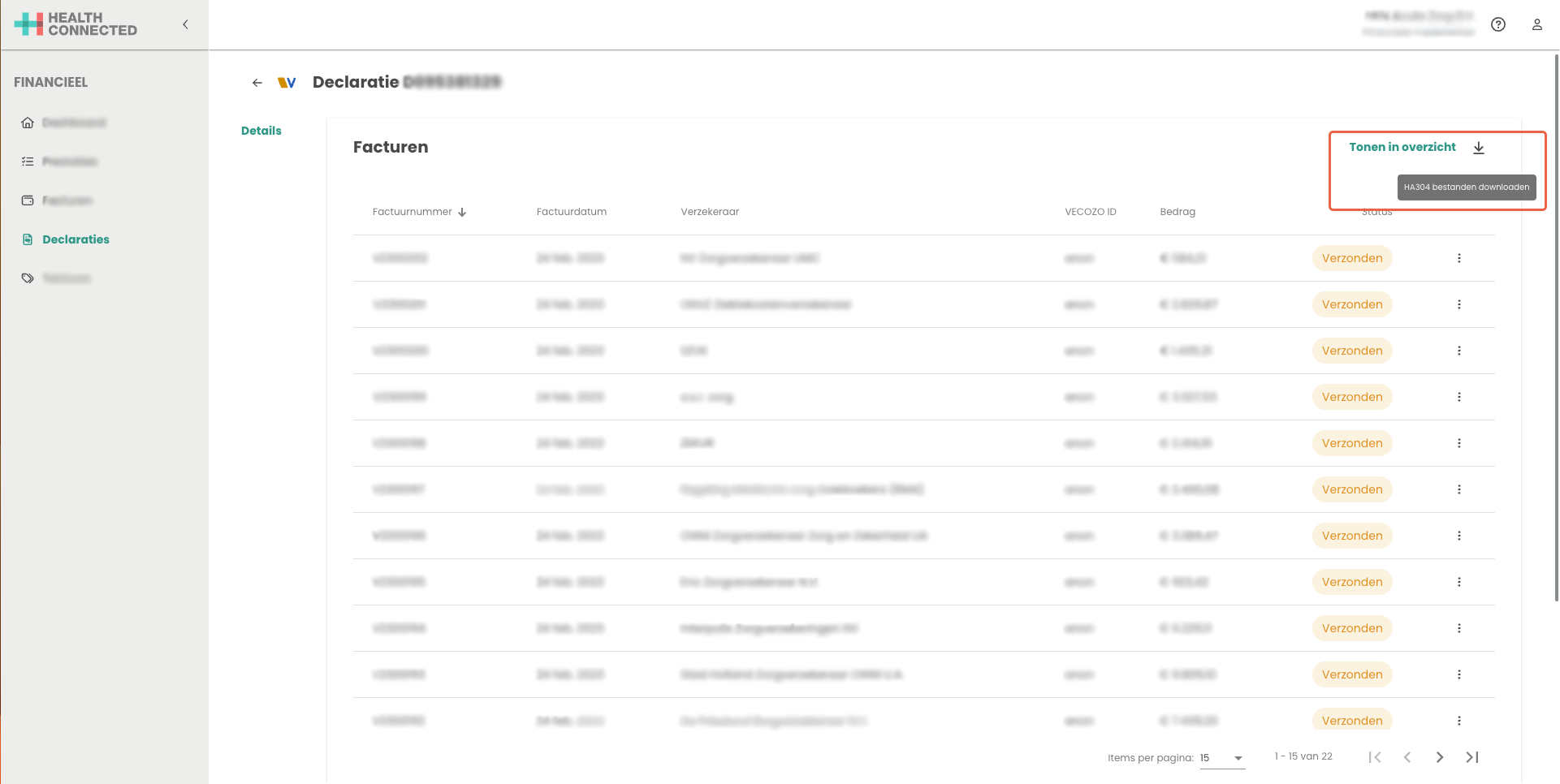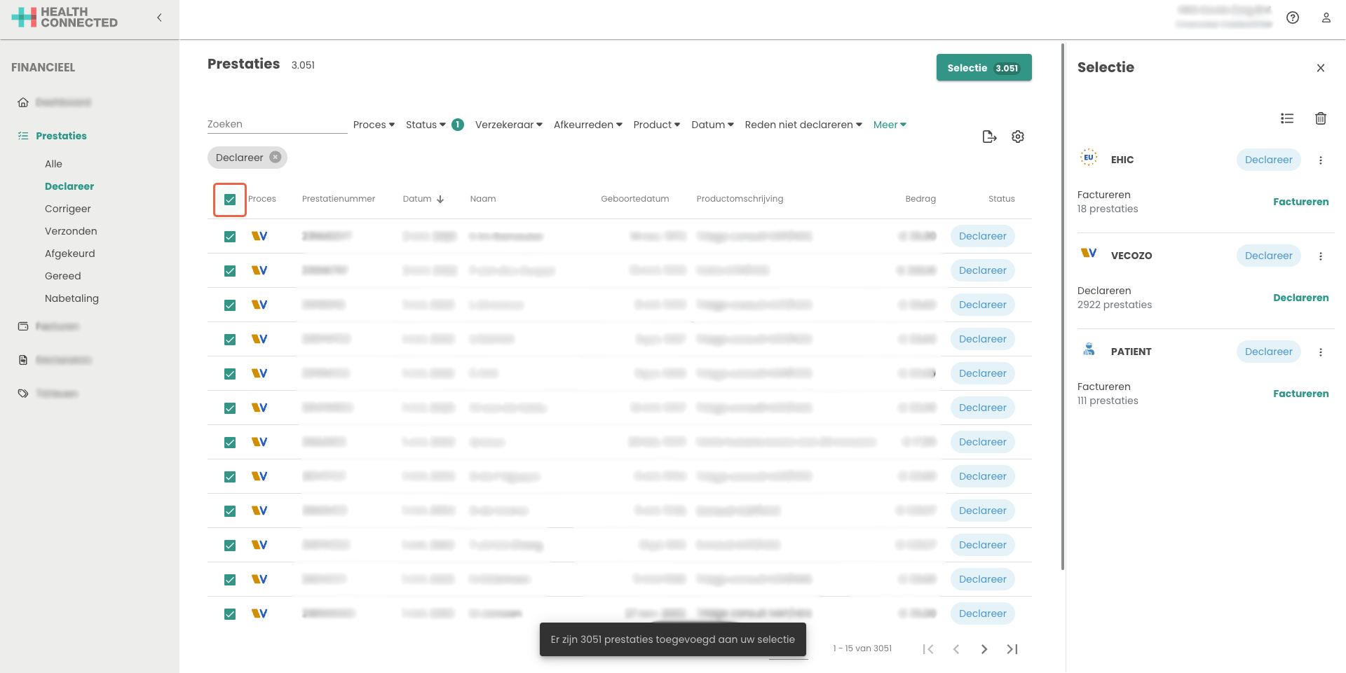 De prestaties die binnen zijn gekomen vanuit de HealthConnected applicatie zijn in het prestatieoverzicht te vinden. Voor het declareren van prestaties klik op de status declareer.