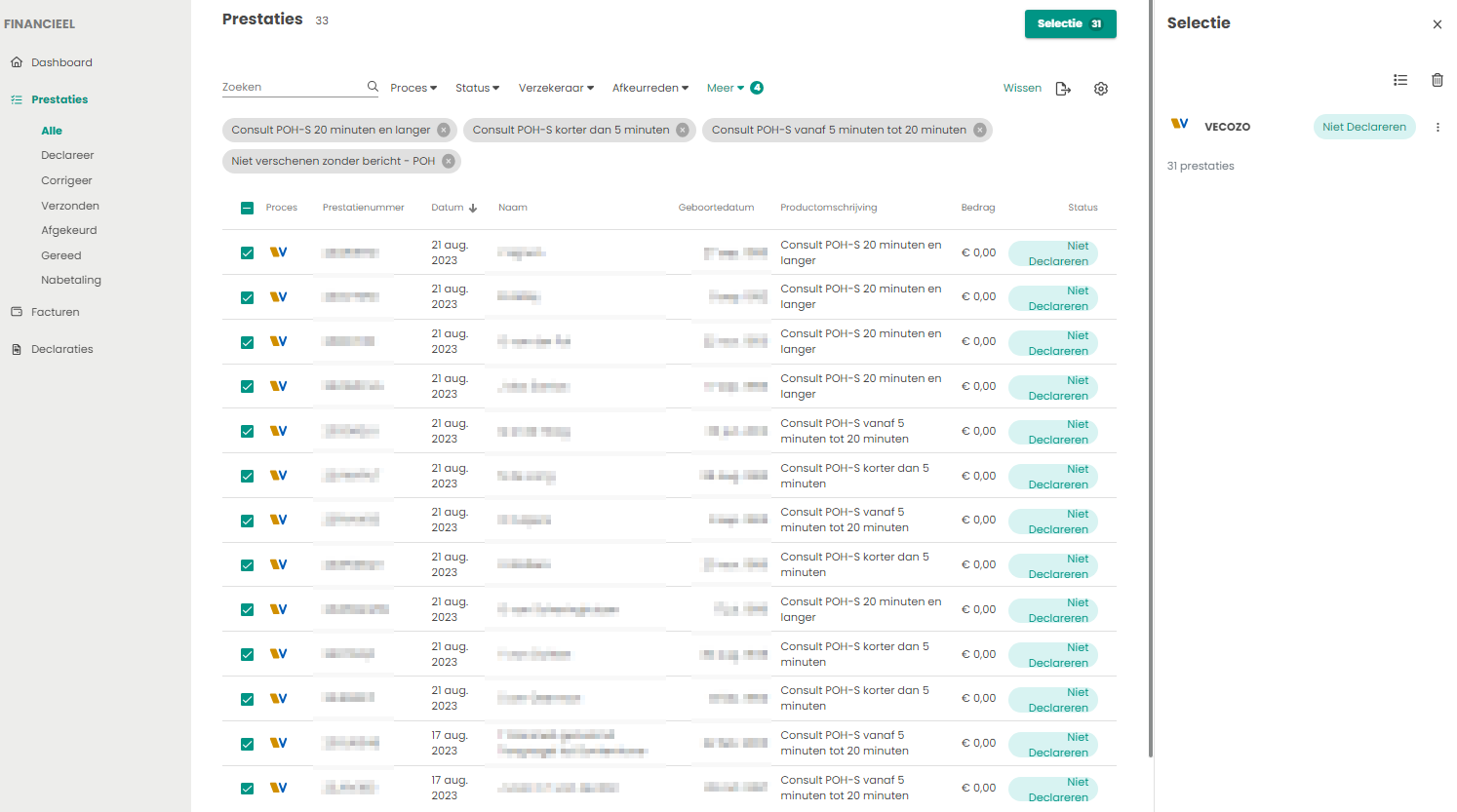Uitgangssituatie is “Prestaties’ met de status “Declareer”.