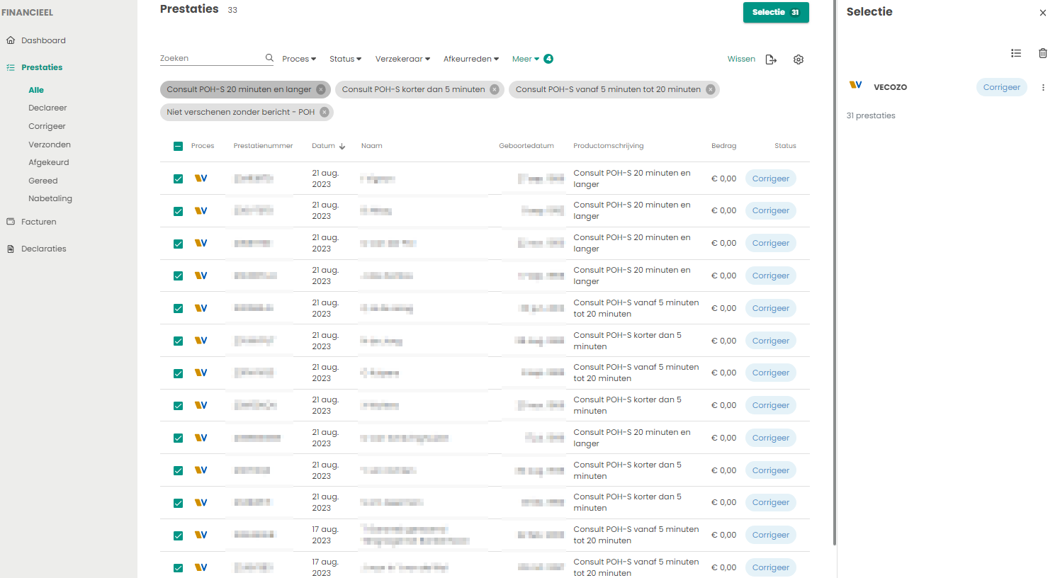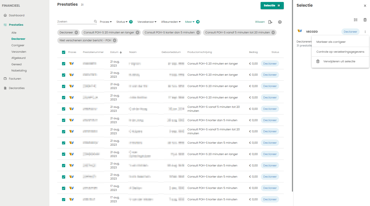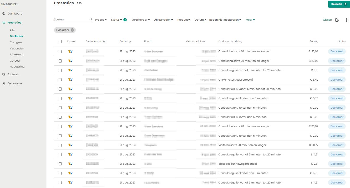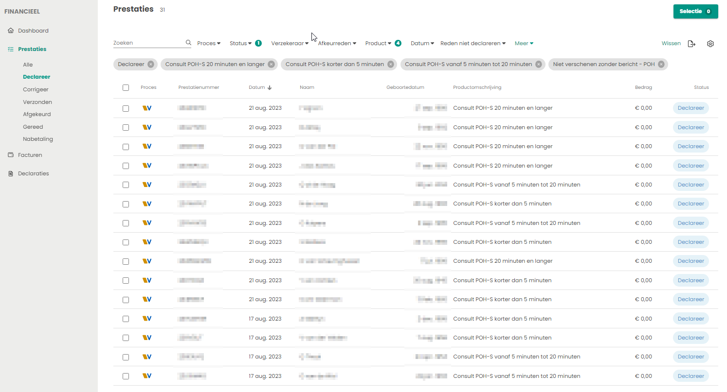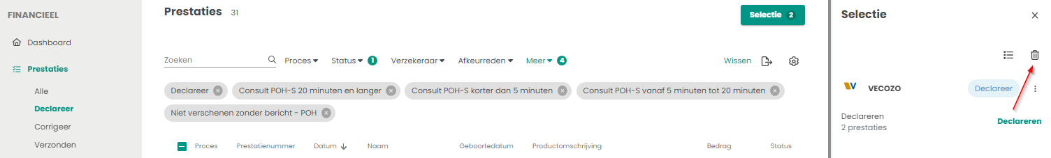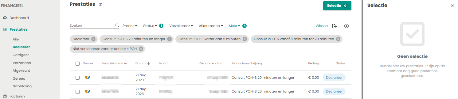 Uitgangssituatie is “Prestaties’ met de status “Declareer”.
