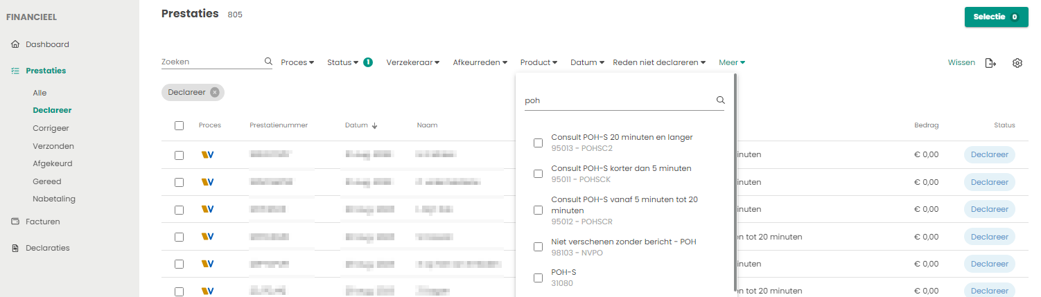 • Ga naar het filter “Product” en geeft de vektis code of eerste letters in van de naam van de betreffende prestatie Bijvoorbeeld in ‘POH’. De prestatiecodes die voldoen aan de omschrijving komen in beeld.