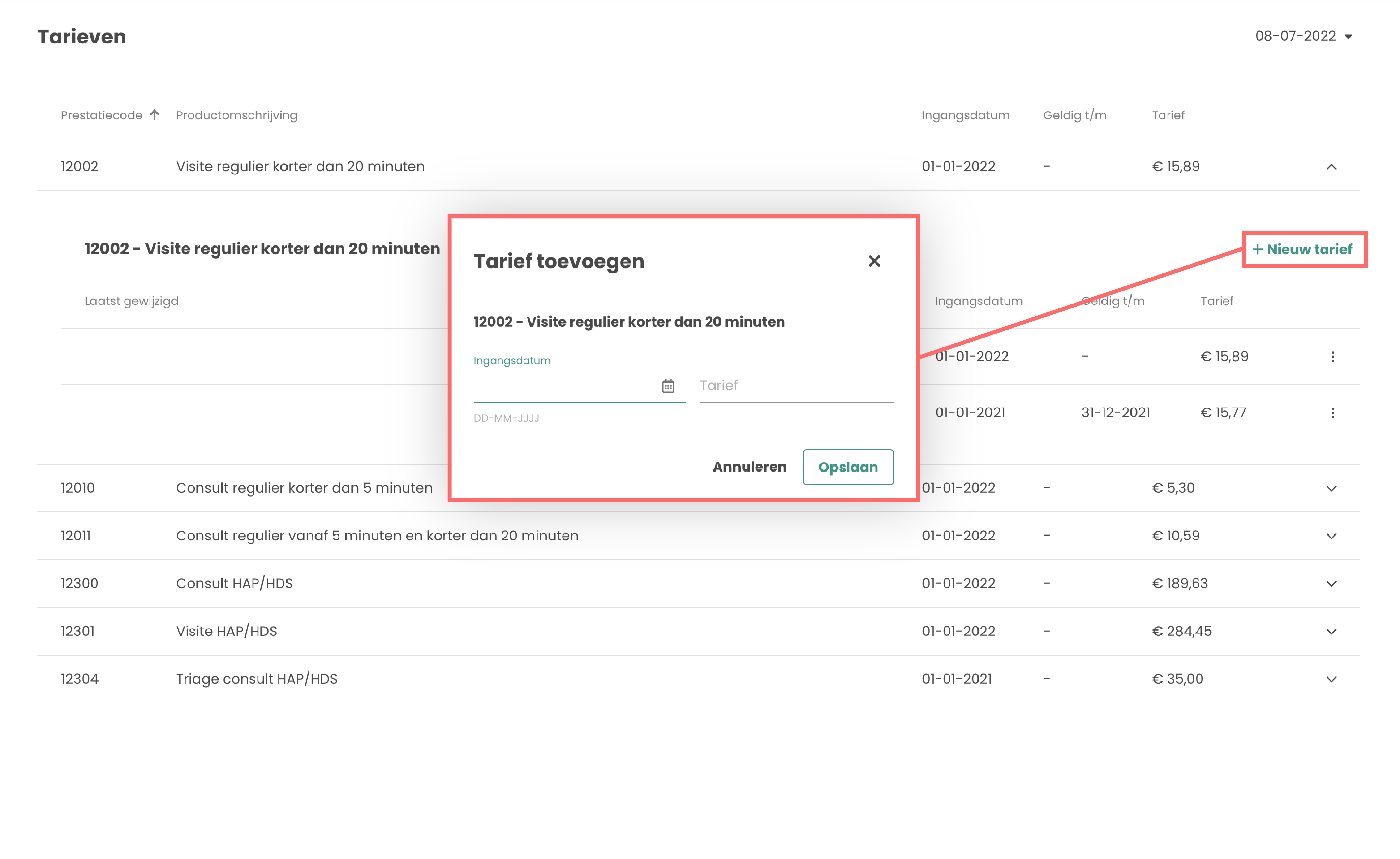 Het tarief van een prestatiecode kan alleen worden aangepast met de gebruikersrol beheerder. Het aanpassen van het tarief gaat als volgt: Open de prestatiecode die aangepast moet worden via . Na het openen staat rechts van de prestatiecode en omschrijving een knop met + nieuw tarief. Vervolgens komt er een pop-up naar voren met daarin mogelijkheid om de ingangsdatum en nieuw tarief toe te voegen.