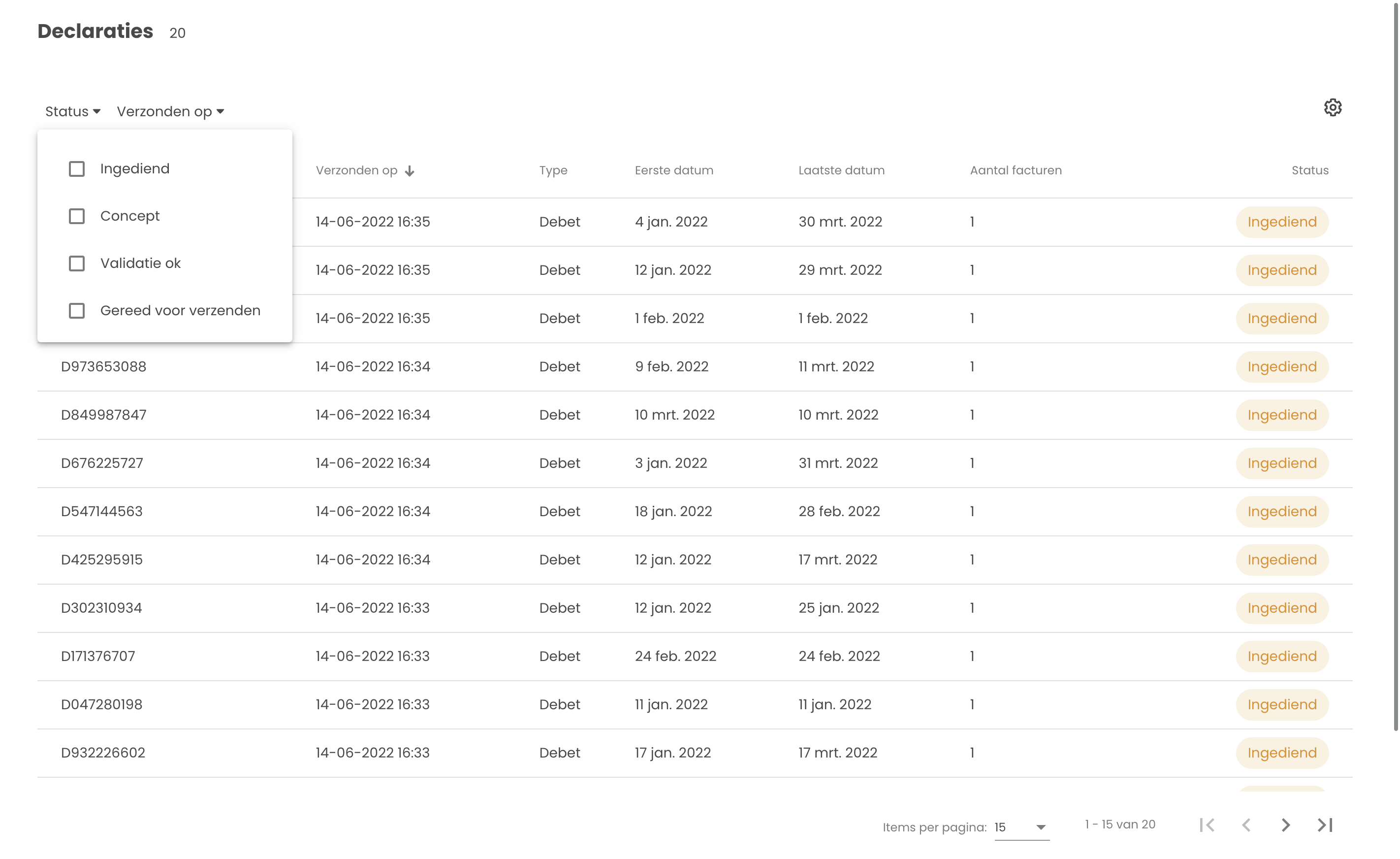 In het declaratieoverzicht is het mogelijk om via een filter het overzicht aan te passen. Binnen dit overzicht zijn de volgende filter opties mogelijk:Status: