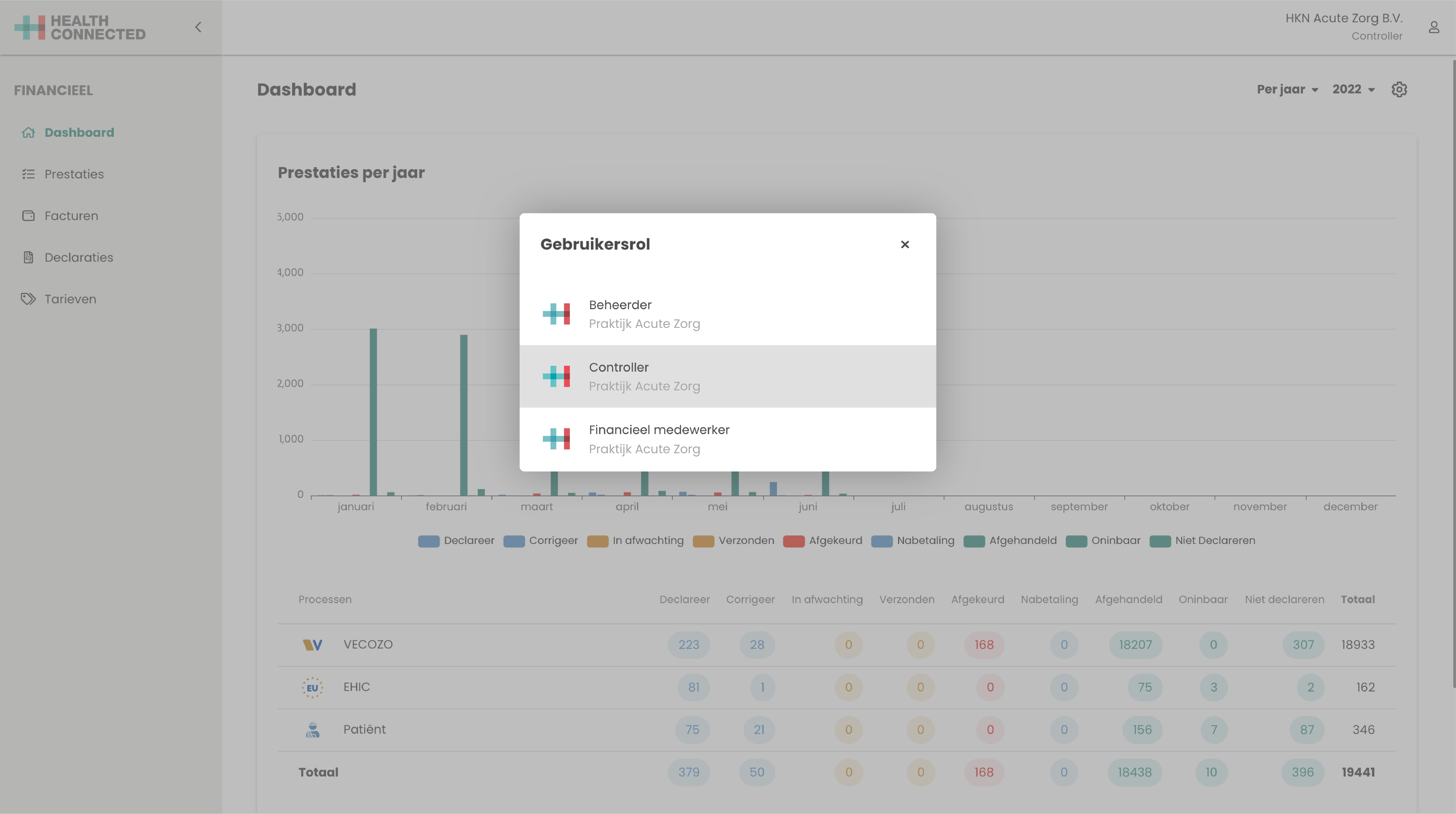 Als een gebruiker meerdere rollen heeft, komt er na het inloggen een pop-up met de keuze voor de gebruikersrol.