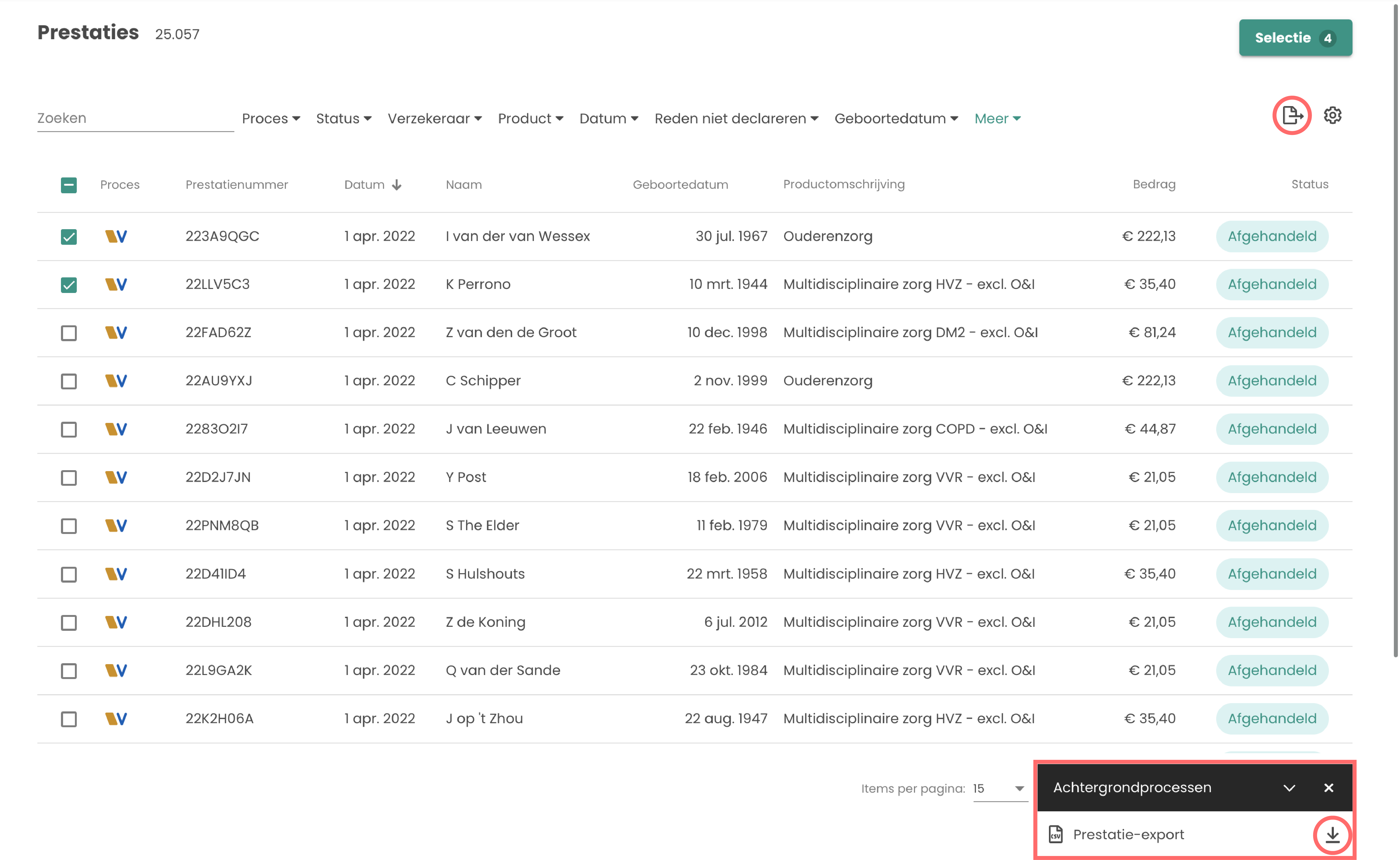 Het gehele prestatielijst kan via de buttonĀ worden omgezet naar een CSV document. Vervolgens kan deze rechts onderin worden gedownload via de button.