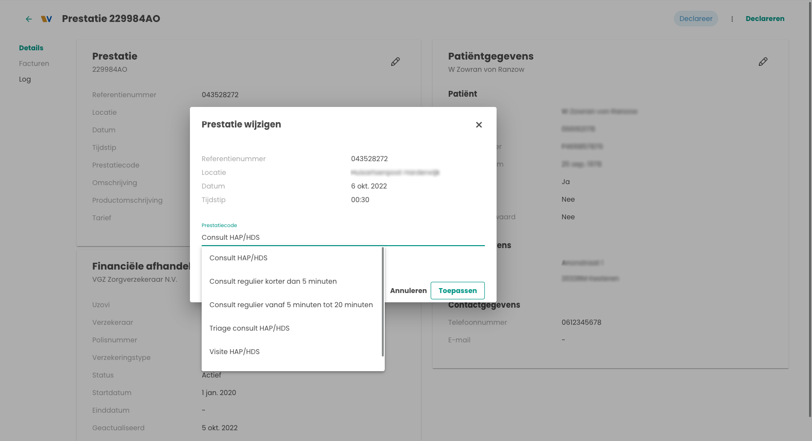 Let op: Prestatiegegevens en prestatiecode kunnen niet worden gewijzigd. Deze zijn o.a. afhankelijk van het tijdstip van het consult.
