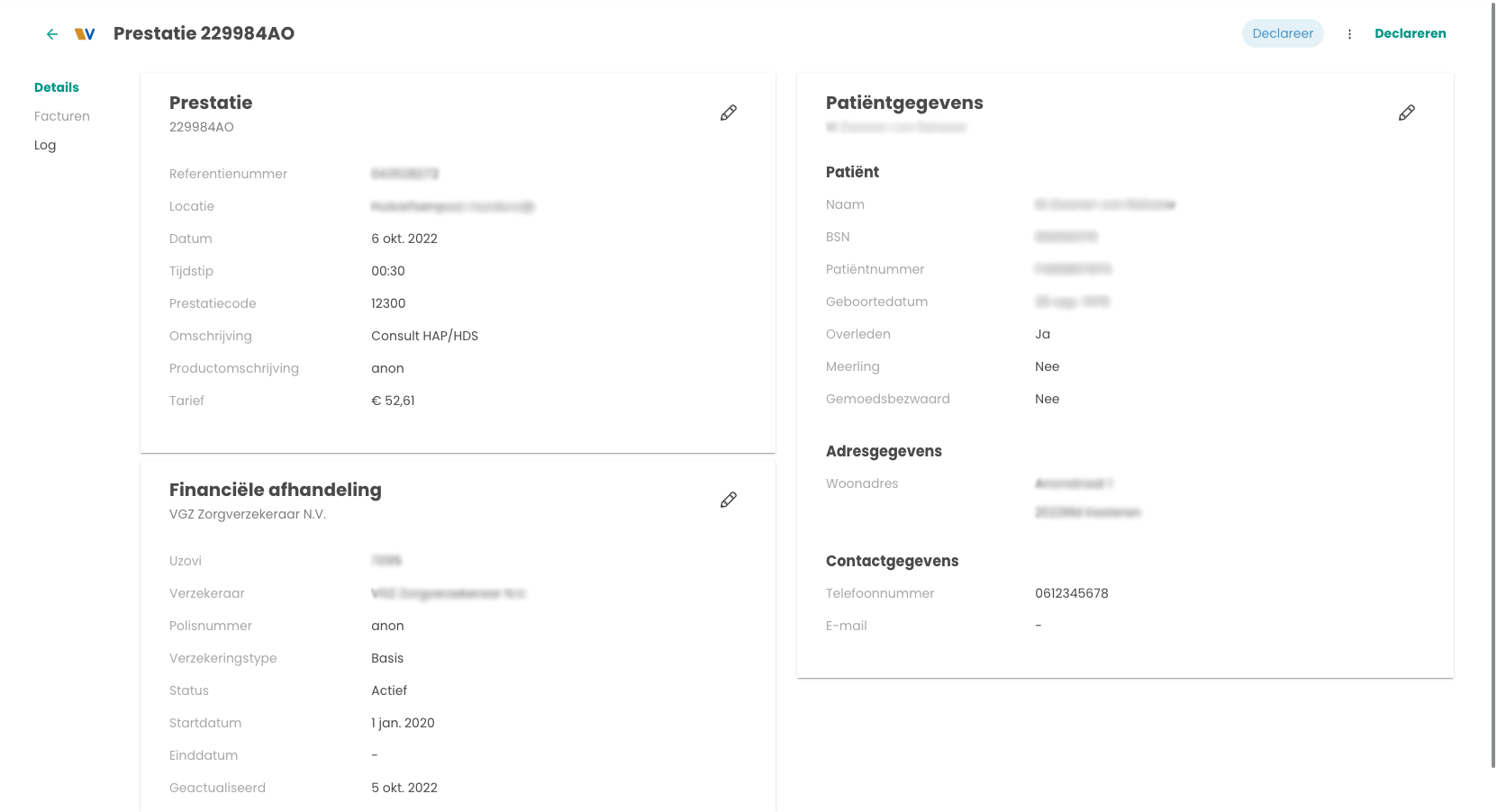 Indien er patiëntgegevens niet kloppen of zorgverzekering onjuist is van een prestatie, kan dit worden gewijzigd via het potloodje