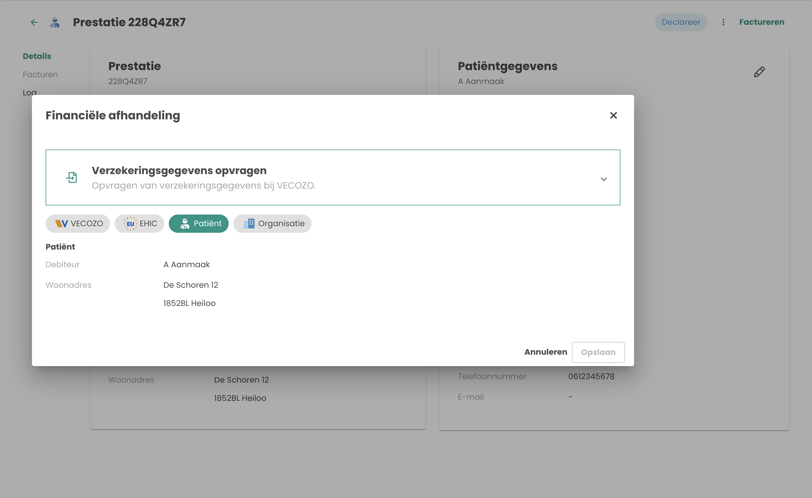 Bij het klikken op het potloodje bij financiële afhandeling opent een scherm waar de verzekeringsgegevens opnieuw opgevraagd kunnen worden. Ook kan hier het declaratieproces gewijzigd worden.