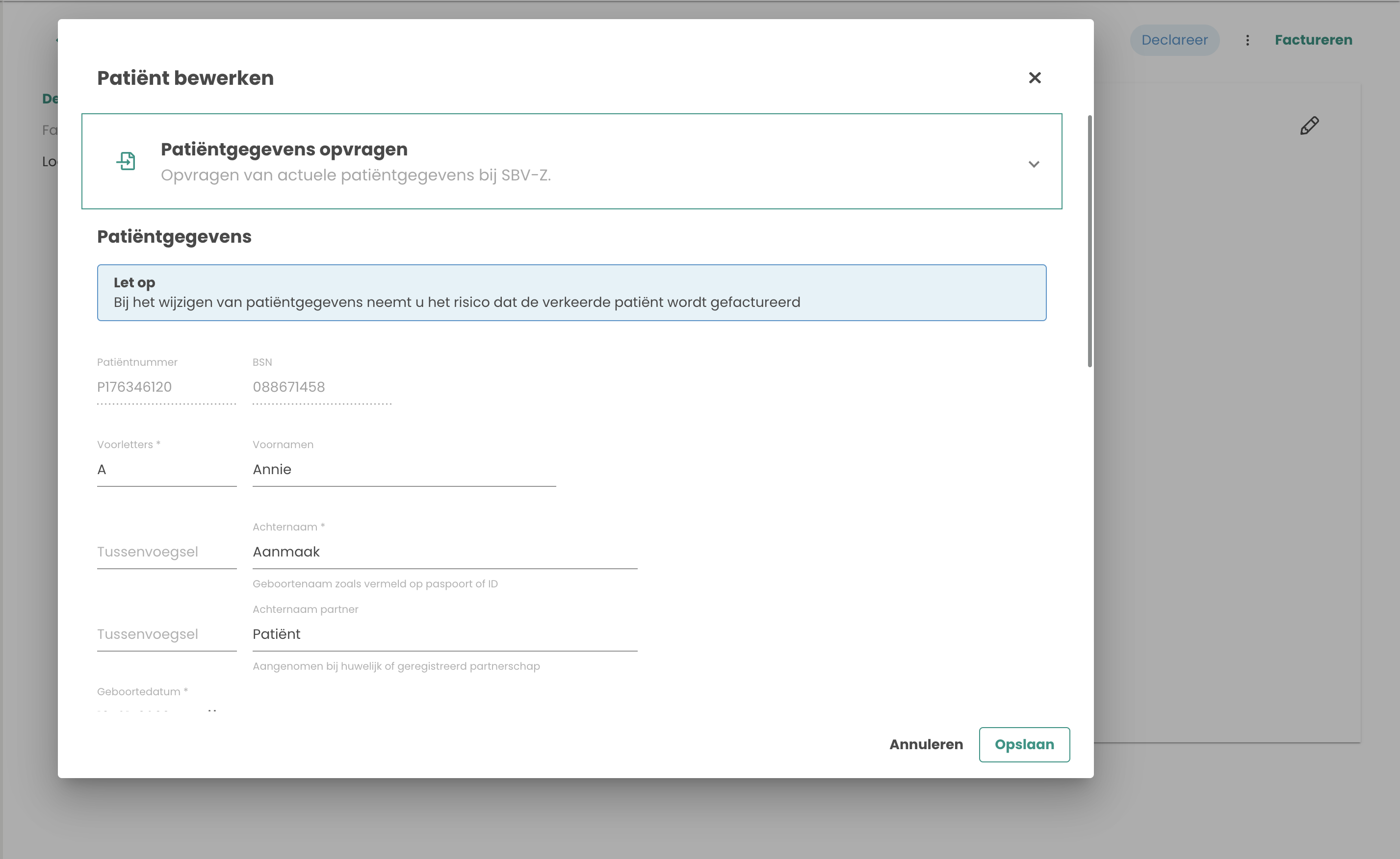 Bij patiëntgegevens is het mogelijk om de naam en het adres te wijzigen. Indien er reeds een BSN is ingevuld kan deze niet worden gewijzigd. Is er geen BSN ingevuld, dan kan deze wel worden ingevoerd.